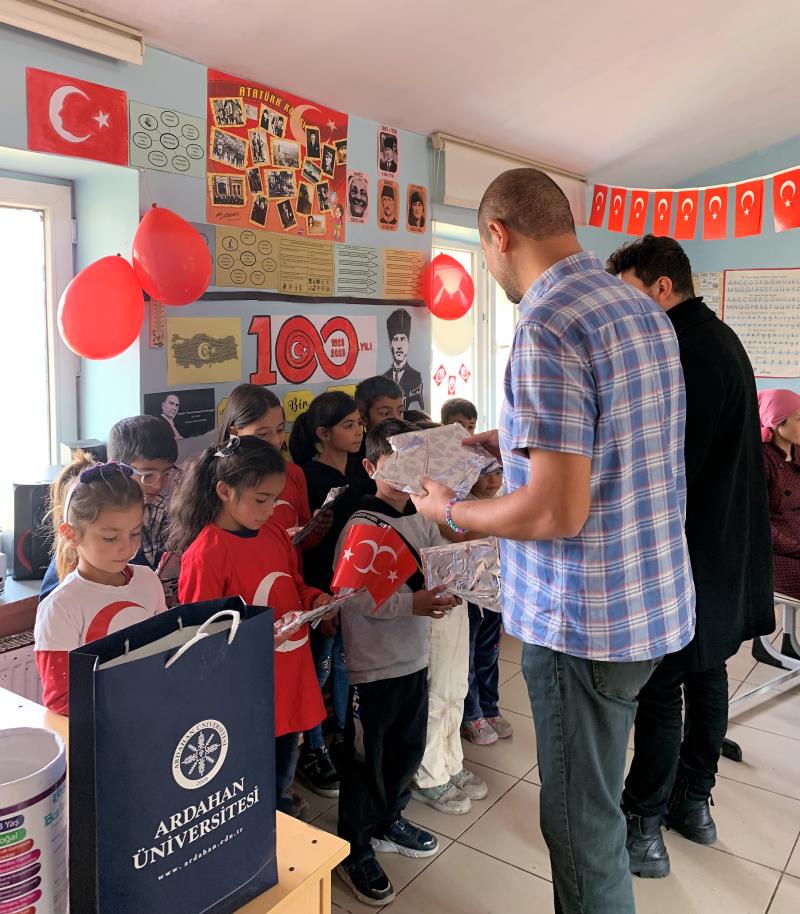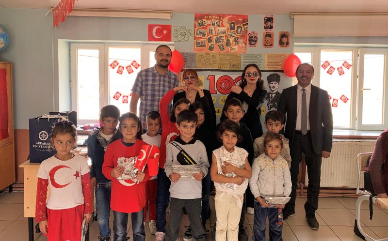 Çıldır Meslek Yüksekokulu olarak Öğr.Gör. Feryat BULUT’un koordinasyonluğunda “Cumhuriyetimizin 100. Yılı” dolayısıyla, “100. Yılımızda 100 Kitap” etkinliği düzenlenerek Gölebakan İlkokulu, Gölbelen İlkokulu, Akçakale İlkokulu, Eski Beyrahatun İlkokulu ve Aşık Şenlik İlkokulu öğrencilerine “100 Kitap” dağıtılarak, çocukların “100. Yıl” coşkusuna ortak olundu. Öğrencilerle, Cumhuriyet ve Atatürk hakkında konuşularak onlarla güzel bir zaman geçirildi.