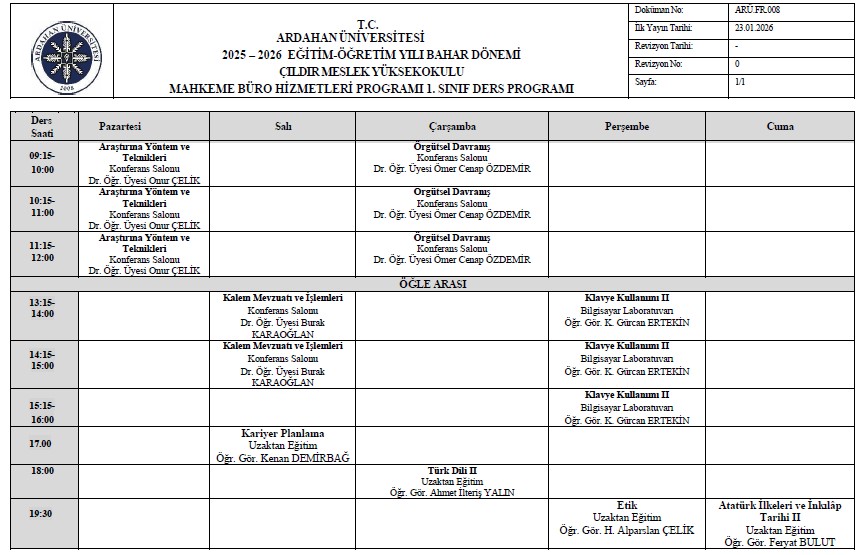 2025-2026 Bahar Dönemi Mahkeme ve Büro Hizmetleri Bölümü Ders Programı
