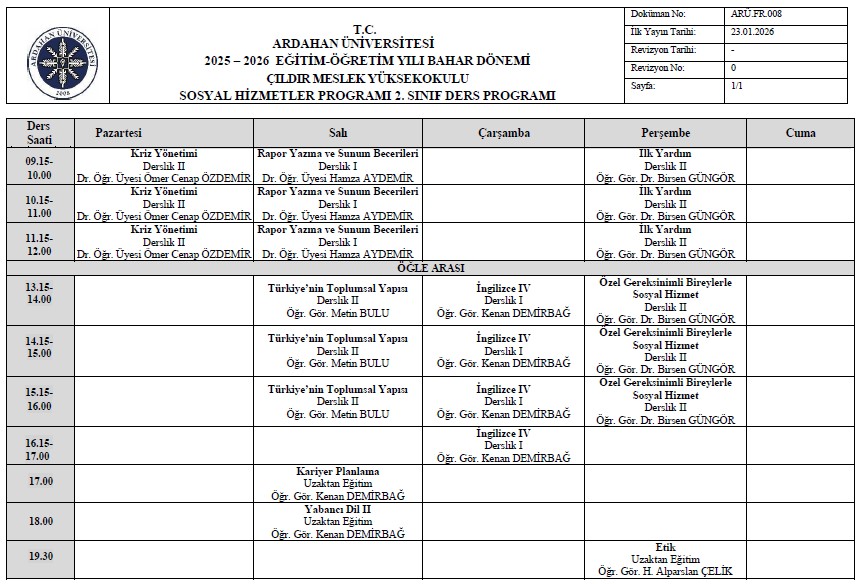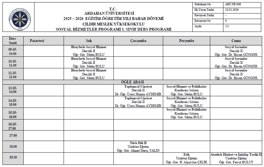 2025-2026 Bahar Dönemi Sosyal Hizmetler Bölümü Ders Programı