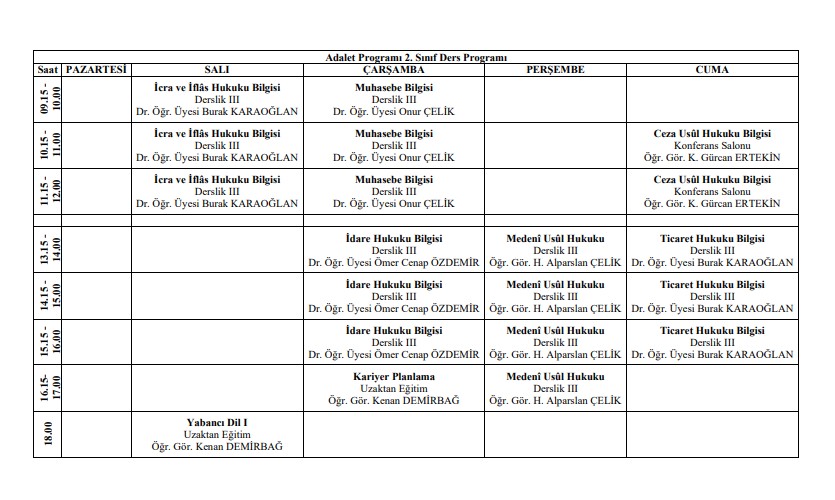 2025-2026 Güz Dönemi Adalet Bölümü Ders Programı