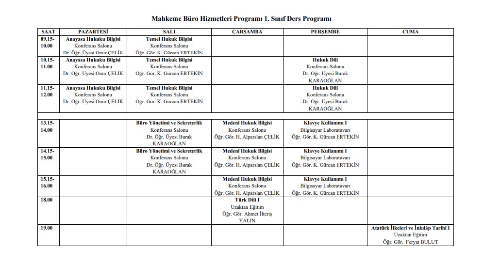 2025-2026 Güz Dönemi Mahkeme ve Büro Hizmetleri Bölümü Ders Programı
