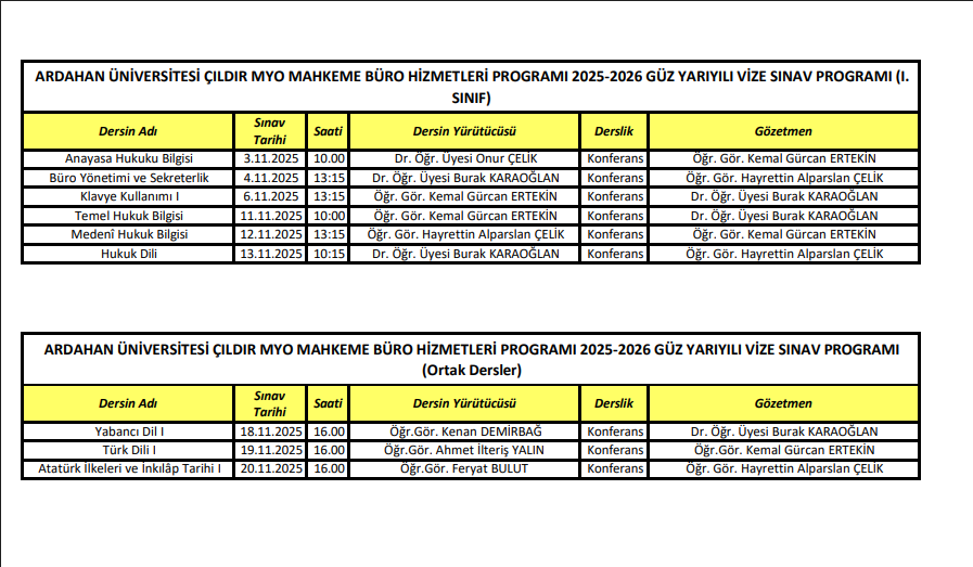 Mahkeme ve Büro Hizmetleri Programı Vize Sınav Takvimi