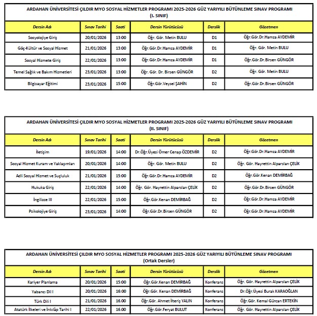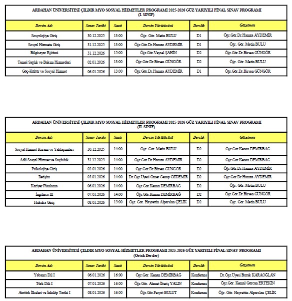 Sosyal Hizmetler Programı Final ve Bütünleme Sınav Takvimi