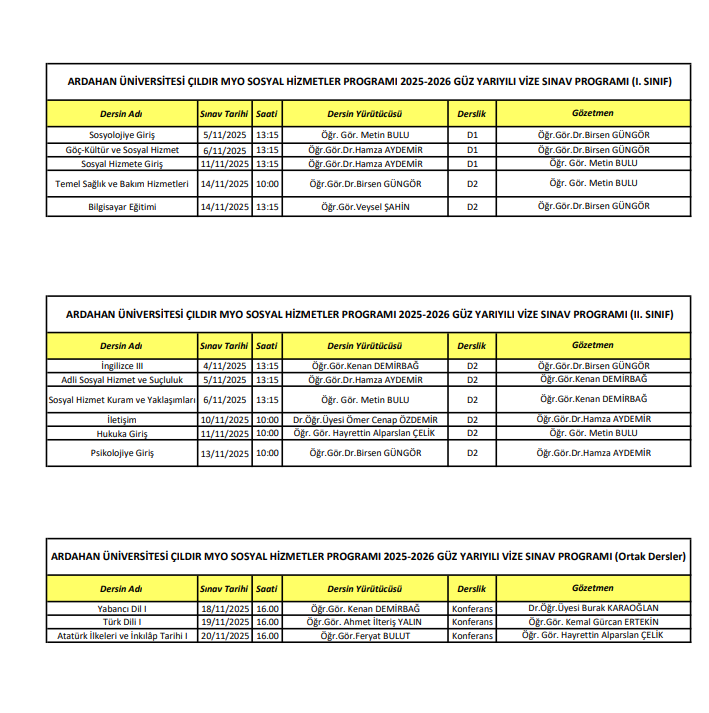 Sosyal Hizmetler Programı Vize Sınav Takvimi